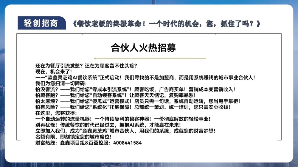 这不仅是餐厅,更是一个可复制的“流量印钞机”。现诚邀城市合伙人,抢占区域独家代理权,共享AI餐饮万亿红利!